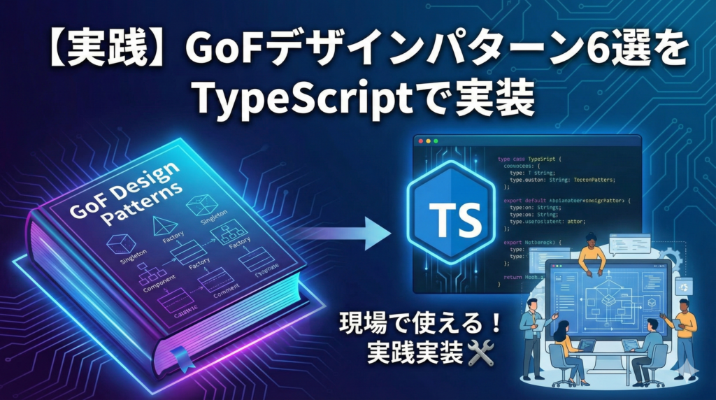 この記事では、TypeScript中級者向けに、実務で本当に役立つGoFデザインパターン6つを厳選し、少し難しめの実践的なコード例とともに解説します。単なる「動物クラスを継承して犬と猫を作る」ような教科書的な例ではなく、APIクライアント、決済処理、イベント駆動など、現場で遭遇するシナリオを題材にしています。
